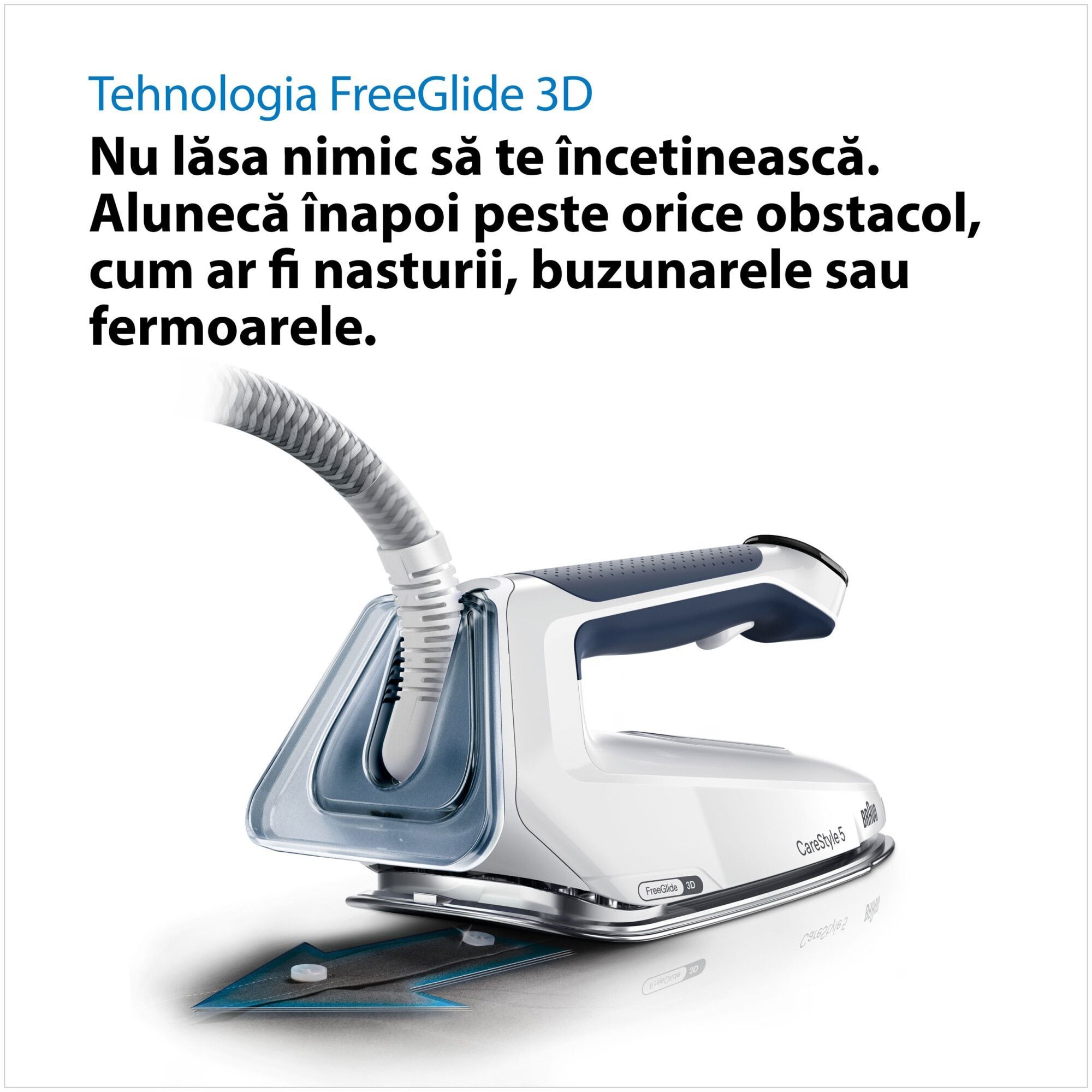 Prima tehnologie FreeGlide 3D din lume este standard pentru toate stațiile de călcat cu aburi de la Braun. Inspirate de designul snowboardului, marginile rotunjite și teșite ale tălpii ajută stația de călcat cu aburi să treacă fără efort peste nasturi și fermoare, fără a se bloca – chiar și în sens invers. Astfel, călcatul este mai ușor și mai rapid, pentru că jumătate din mișcările dvs. atunci când călcați haine sunt în sens invers.