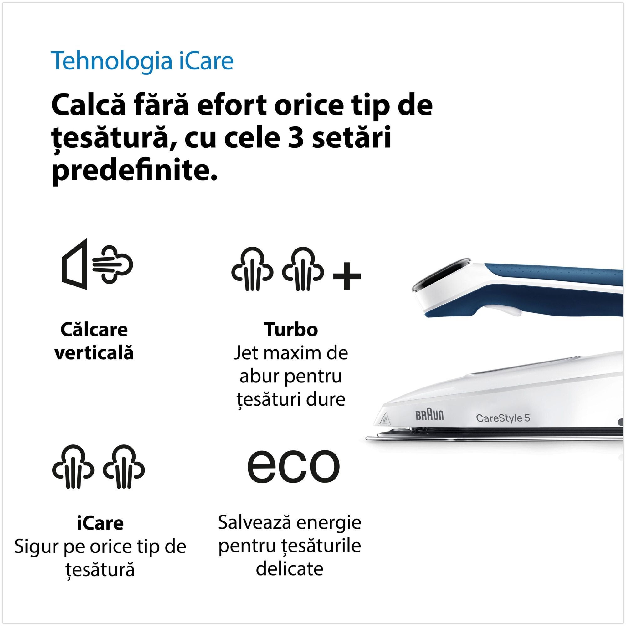 Îmbunătățește-ți rutina de călcat și economisește timp pentru ceea ce contează cu adevărat. Noua stație de călcat Braun CareStyle 5 este ultra-puternică, oferind un debit de abur continuu de până la 150g/min datorită tehnologiei inovatoare PowerSteam. Bucură-te de rezultate profesionale chiar și în cazul celor mai dificile cute. Certificat ergonomic*, fierul de călcat este proiectat pentru a oferi o sesiune de călcare fără efort. Mânerul deschis reduce presiunea de la nivelul încheieturii, favorizând o poziție naturală a mâinii. Bucură-te de plăcerea oferită de hainele bine călcate fără a compromite timpul și confortul tău prețios.
