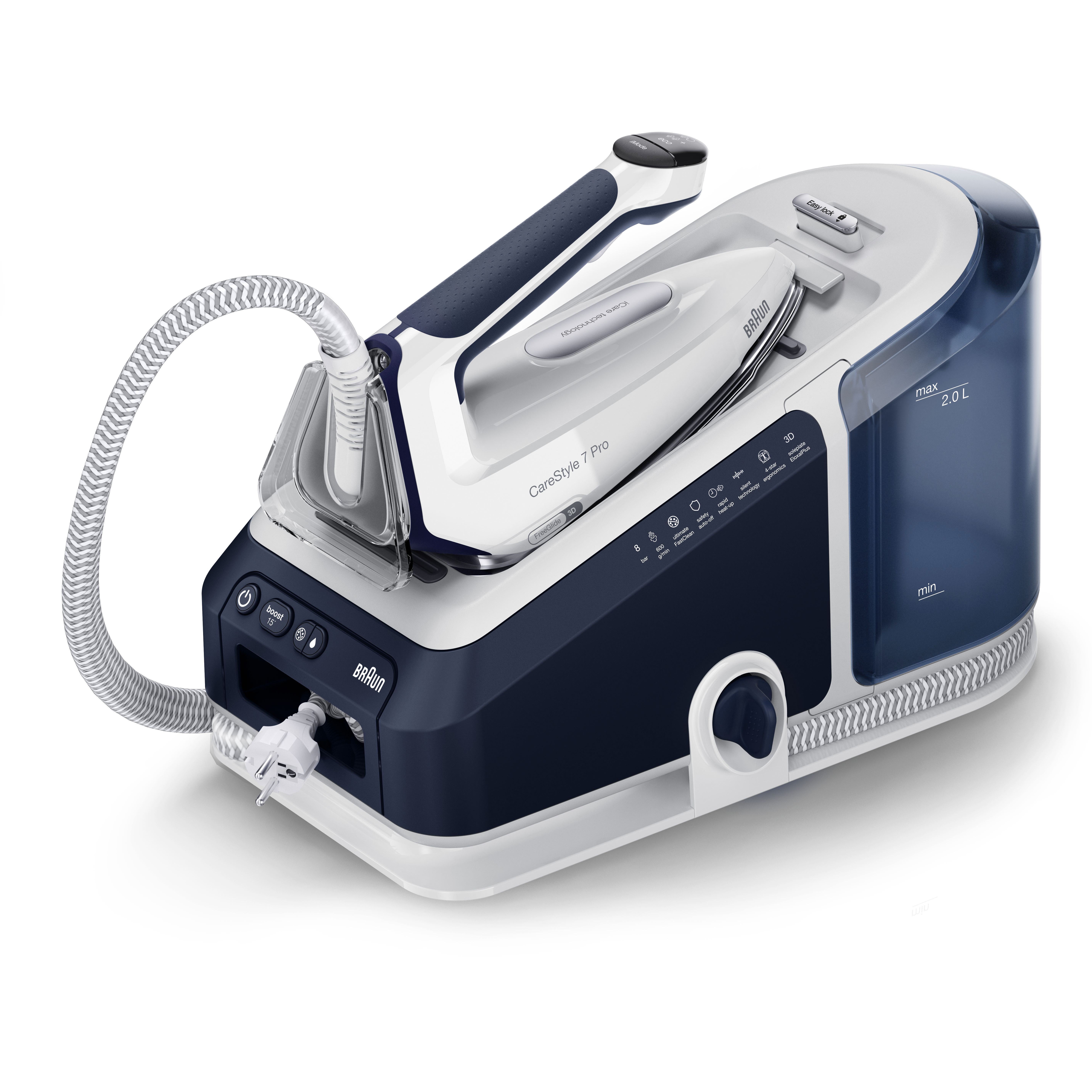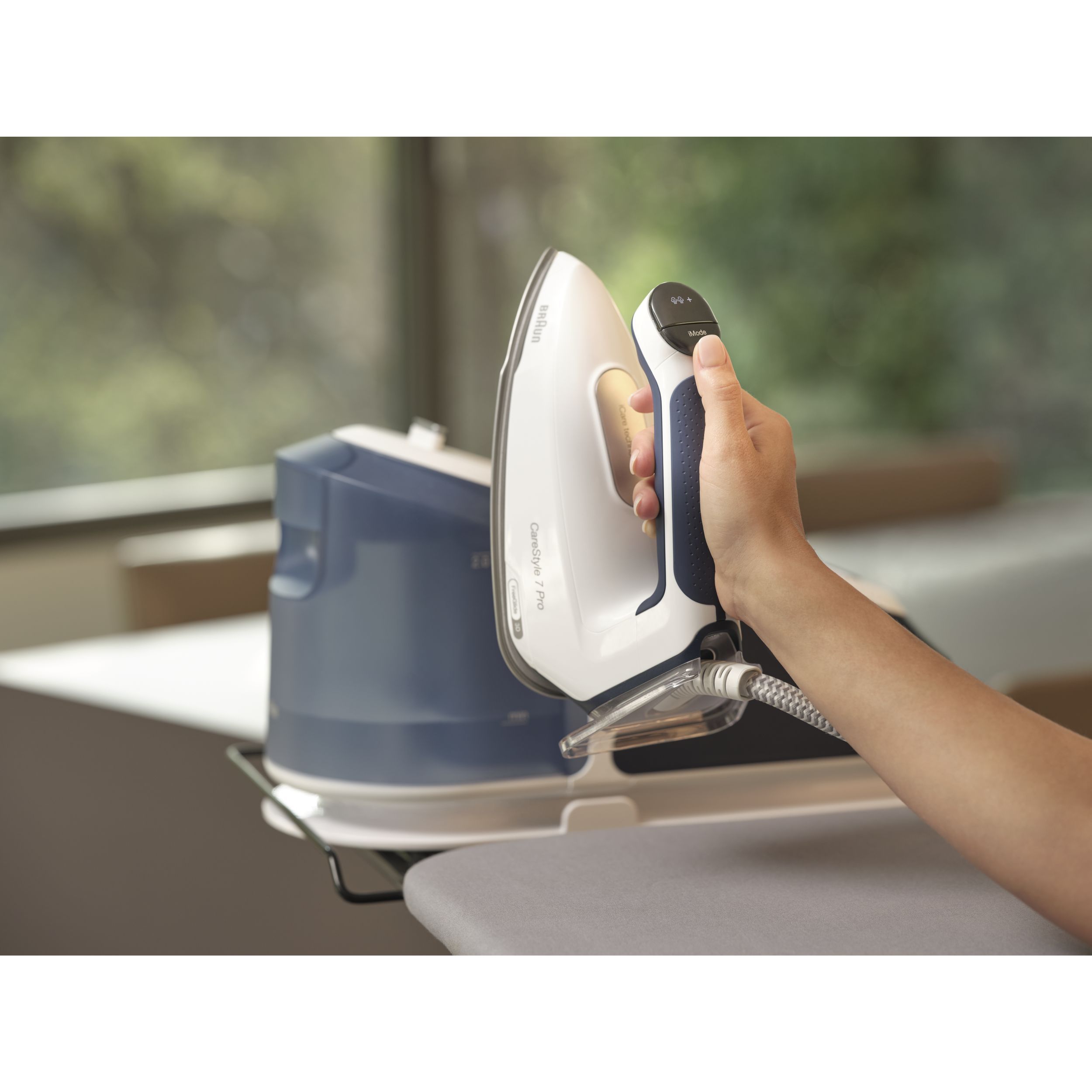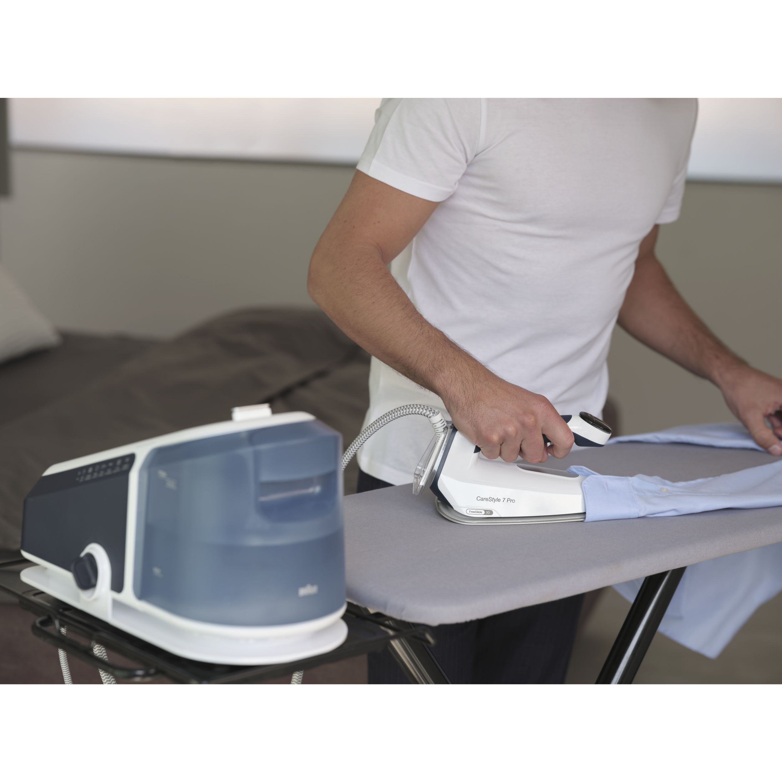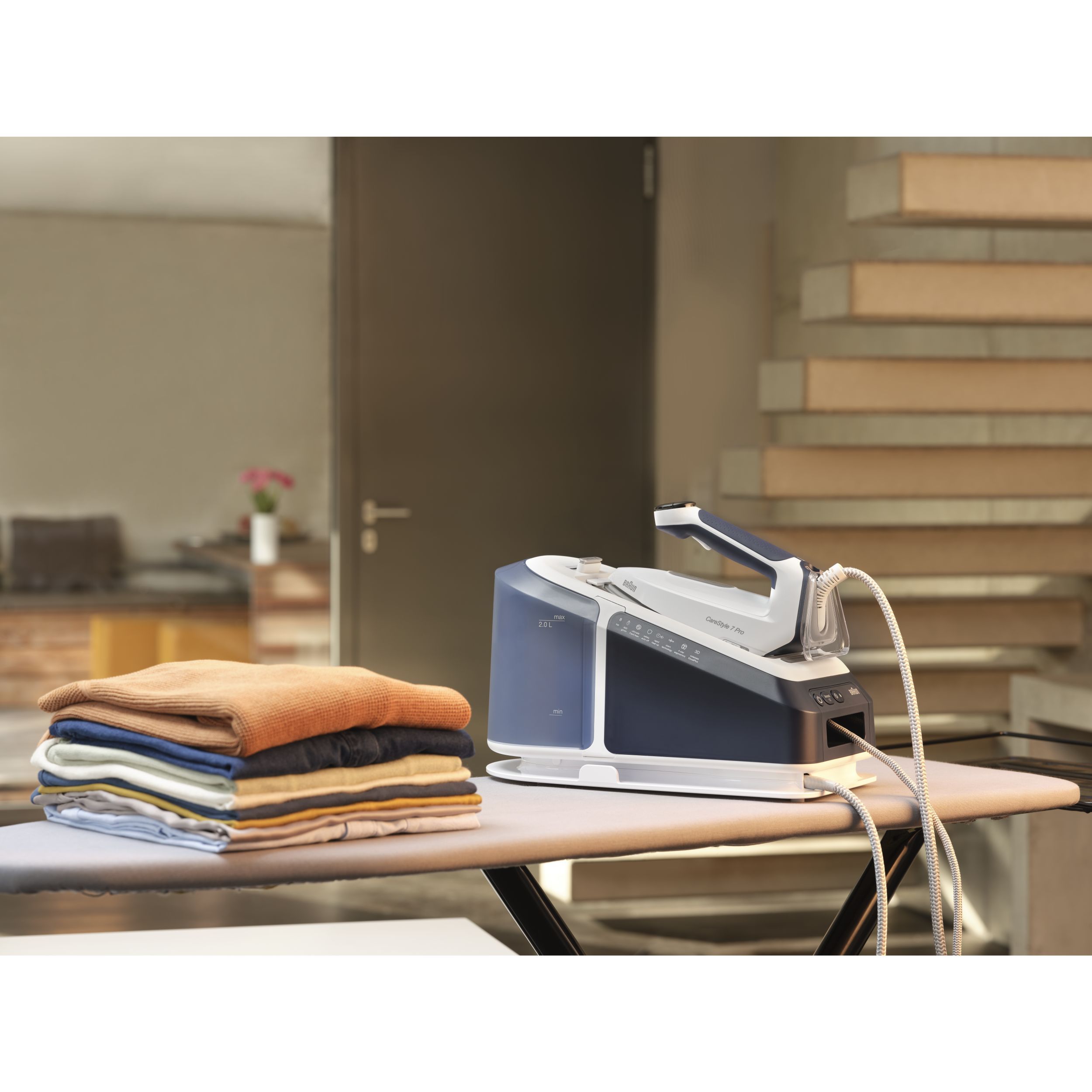 Noua stație CareStyle 7 Pro este cel mai puternic sistem de călcat* – furnizând abur continuu de până la 190 g/min* datorită tehnologiei inovatoare PowerSteam. Descoperiți un nou nivel de calitate a călcatului și funcții inovatoare care vă permit să gestionați ușor și rapid cele mai dificile materiale și cele mai persistente cute. Obțineți rezultate profesionale de călcat, cu ușurință și fără efort, datorită designului special ergonomic al mânerului primului fier de călcat certificat ergonomic din lume**.