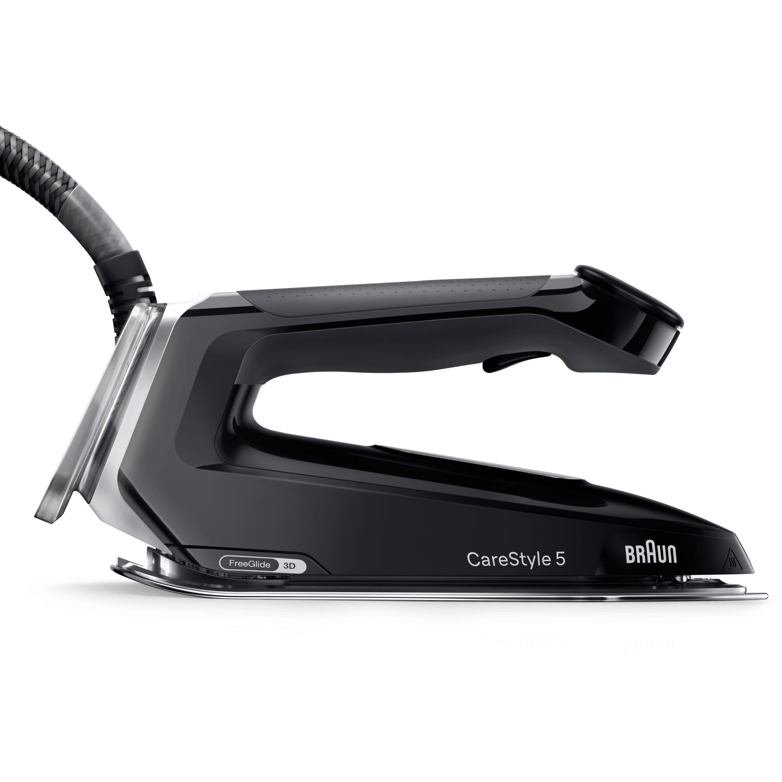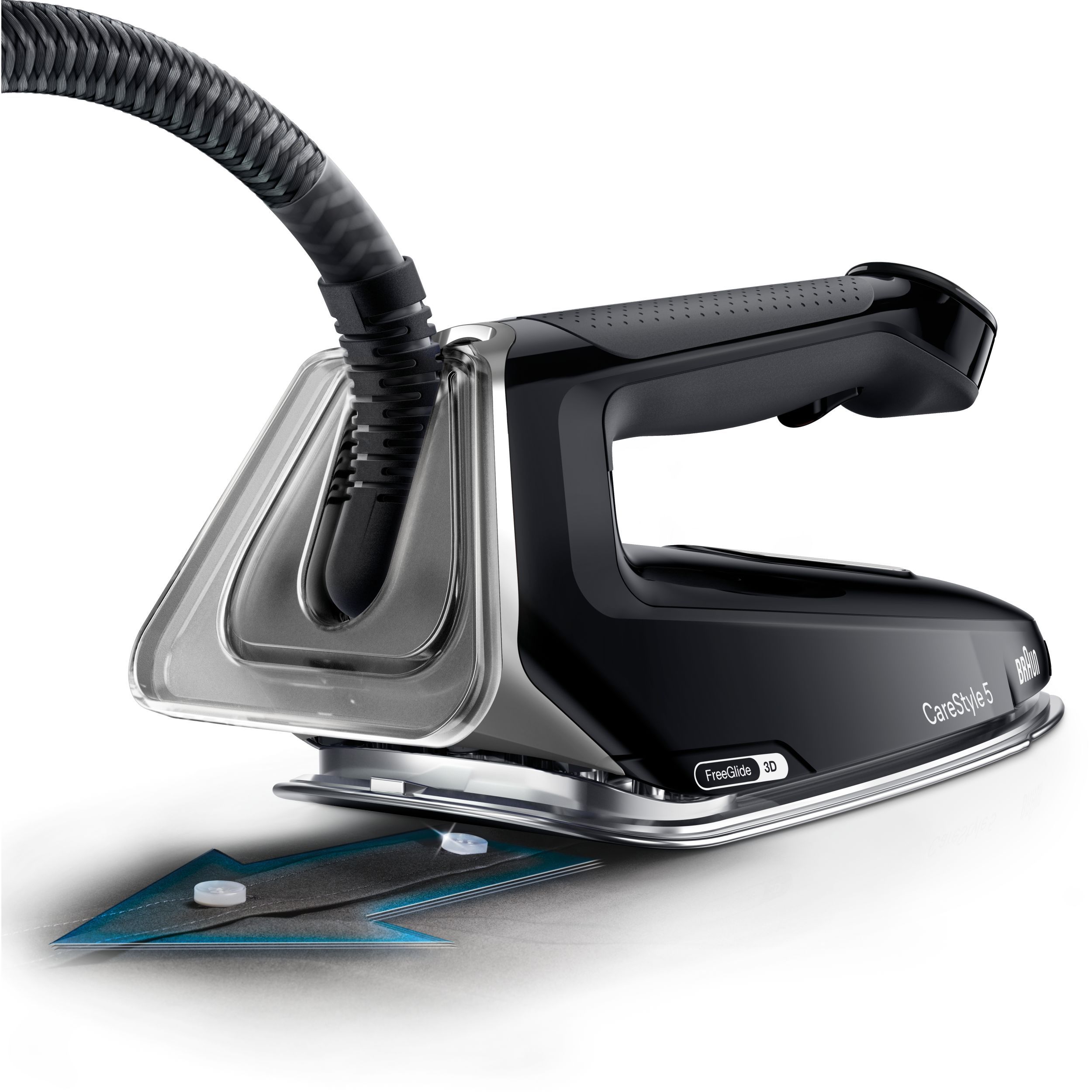 Prima tehnologie FreeGlide 3D din lume este standard pentru toate stațiile de călcat cu aburi de la Braun. Inspirate de designul snowboardului, marginile rotunjite și teșite ale tălpii ajută stația de călcat cu aburi să treacă fără efort peste nasturi și fermoare, fără a se bloca – chiar și în sens invers. Astfel, călcatul este mai ușor și mai rapid, pentru că jumătate din mișcările dvs. atunci când călcați haine sunt în sens invers.