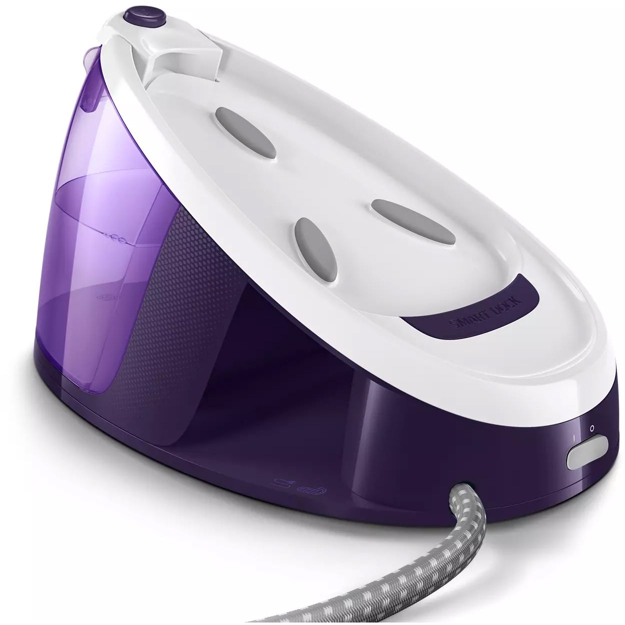 Blocare pentru transport sigur şi uşor. Blochează fierul în siguranţă pe baza staţiei pentru a-l transporta cu uşurinţă prin casă şi pentru a reduce riscul de atingere accidentală a tălpii fierbinţi.