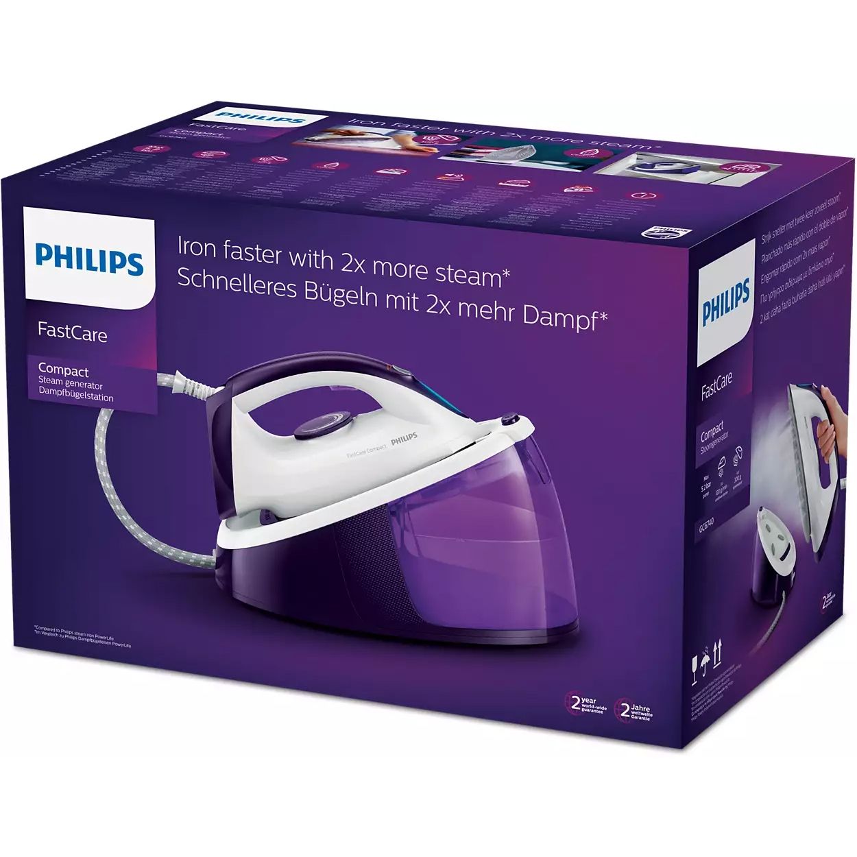 Stație de călcat cu abur Philips FastCare Compact GC6740/30, 2400W, Presiune 5.2bar, Continuu 120g/min, Jet 300g, Talpă Ceramic , Rezervor 1.5l, F 1.6m, C 1.65m, Fier 1.25kg