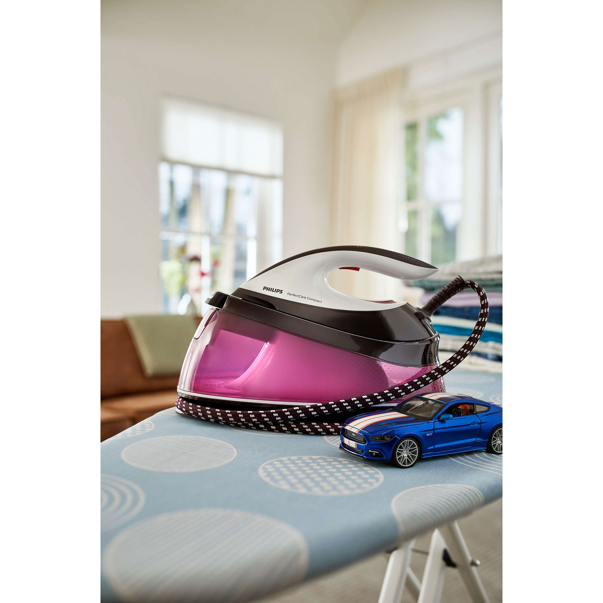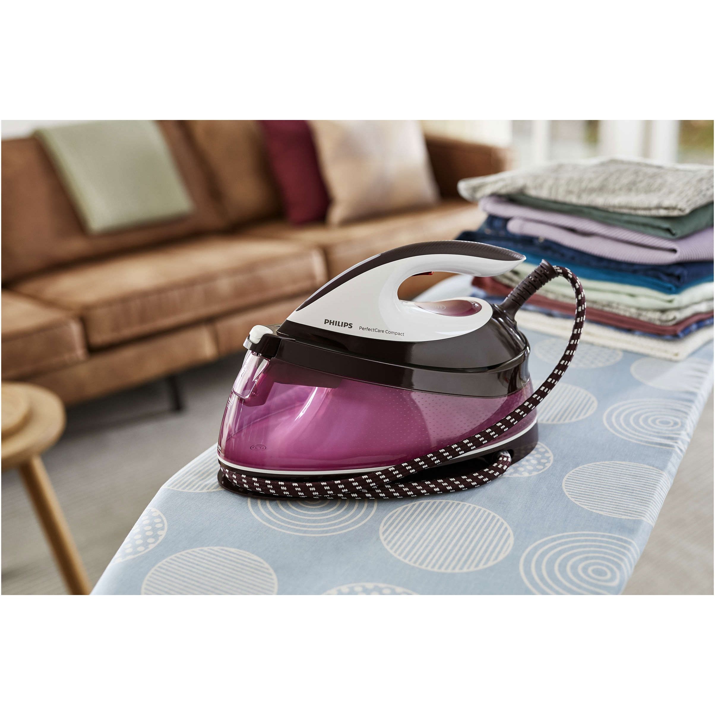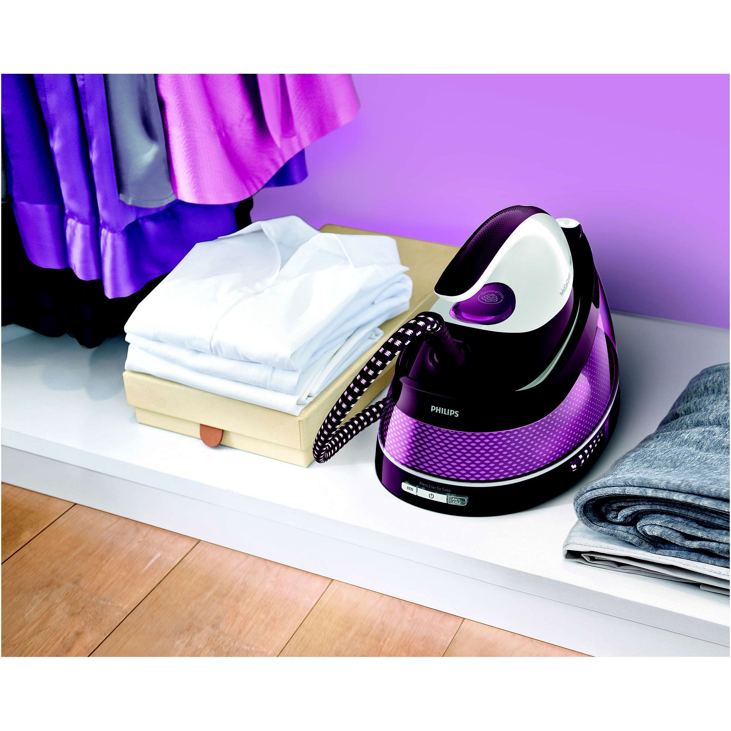 Stație de călcat cu abur Philips GC7808/40, Gama PerfectCare Compact, Putere 2400W, Presiune 5.3bar, Continuu 120g/min, Jet 280g, Talpă SteamGlide, Rezervor 1.5l, F 1.6m, C piv 180° 1.8m, Fier 1.2kg