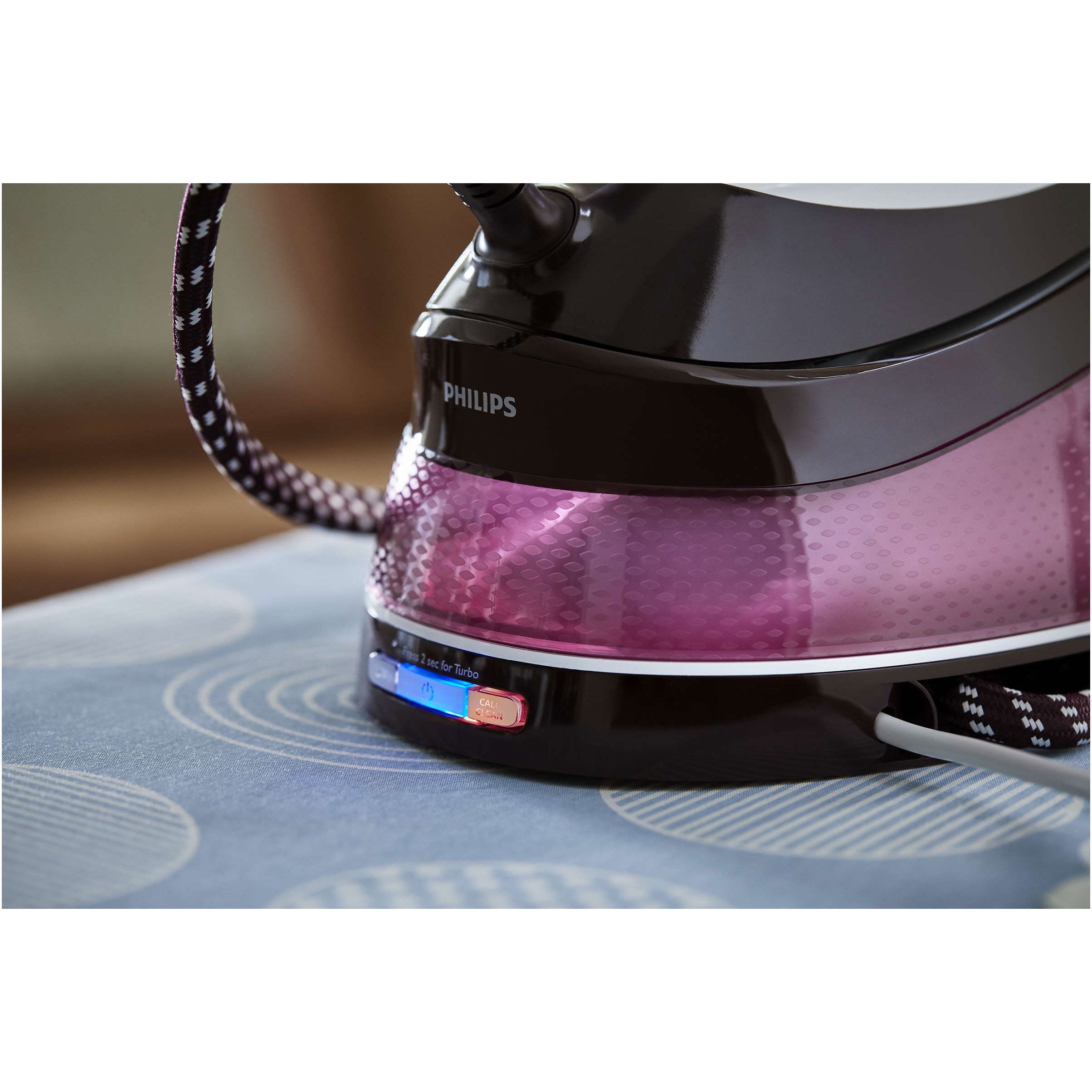 Sistem încorporat pentru curăţare uşoară, pentru performanţă de lungă durată. Detartrarea periodică îţi protejează fierul de călcat şi menţine performanţa aburului. Sistemul inteligent de detartrare şi curăţare este o funcţie integrată de detartrare şi curăţare care prelungeşte durata de viaţă a staţiei de călcat cu abur. Prin intermediul semnalelor luminoase şi sonore, aparatul de călcat îţi va reaminti de necesitatea curăţării şi a detartrării. Pentru a porni procesul, nu trebuie decât să aşezi aparatul de călcat pe recipientul de detartrare şi de curăţare inteligentă. Apa murdară şi depunerile de calcar sunt colectate în aproximativ 2 minute, iar la sfârşit staţia de călcat cu abur va emite un semnal sonor, indicând că utilizarea poate fi reluată.