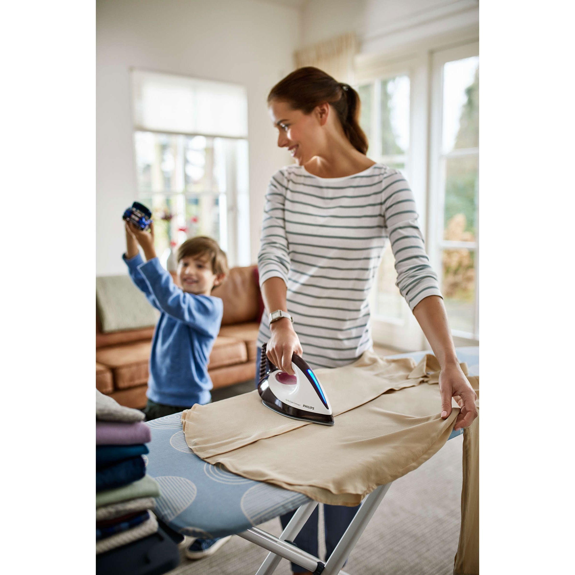 Talpa fierbinte poate fi lăsată în siguranţă pe masa de călcat. Tehnologia inovatoare OptimalTEMP garantează că nu vor exista arsuri pe niciunul dintre articolele care pot fi călcate. Pe lângă siguranţa pe care ţi-o oferă în timpul călcării, înseamnă şi că poţi lăsa talpa fierbinte a fierului direct pe masa de călcat din bumbac, fără a o deteriora deloc. Acest lucru contribuie la reducerea disconfortului încheieturilor mâinilor, deoarece nu va trebui să ridici la fel de des fierul de călcat de pe baza acestuia.