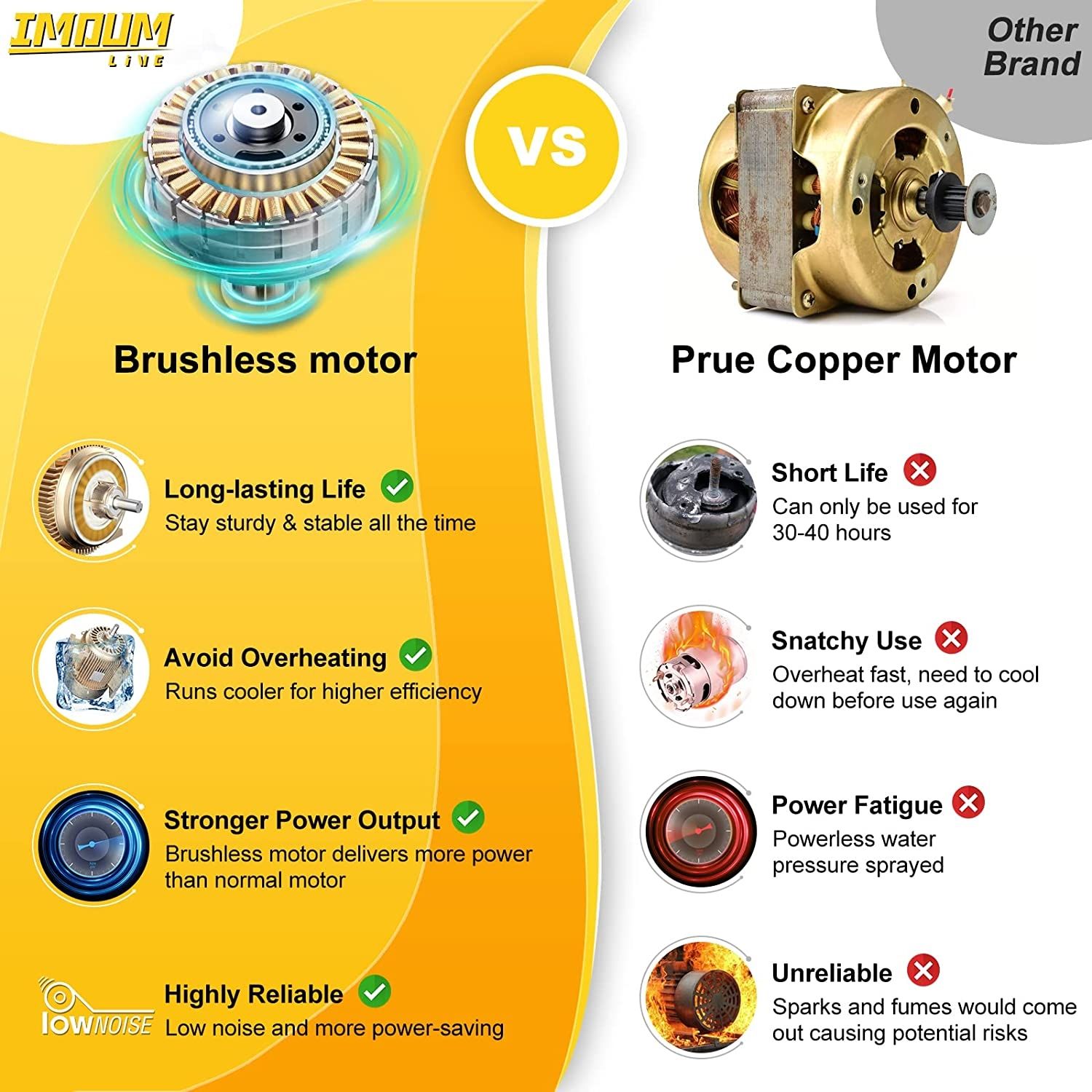 Are o durată de viață mai mare cu 330%, o putere de ieșire mai mare cu 80%, un consum de energie mai mic cu 60% și un lucru cu 230% mai mare eficiență decât alte mașini de spălat cu presiune care utilizează motoare din cupru pur periat.