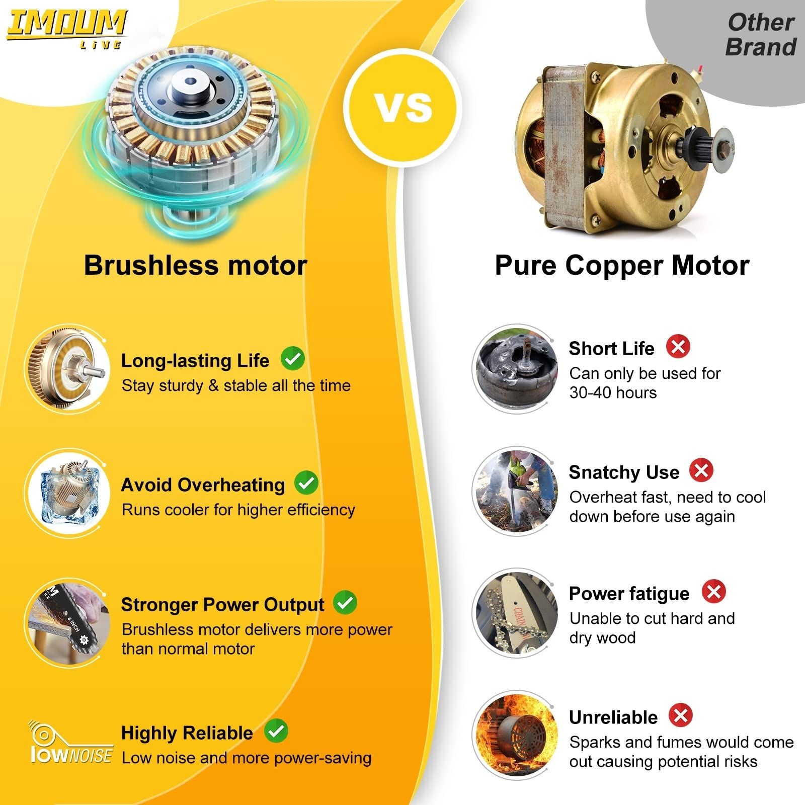 Proiectat cu mecanici de top în stil profesionist, folosind motorul fără perii de înaltă calitate ca putere centrală, acest mini ferăstrău cu lanț oferă o durată de viață mai lungă, o putere mai puternică și o economie optimă de energie - indiferent ce presupune munca. Cu o tehnologie inovatoare cu cuplu ridicat, mini-ferăstrăul cu lanț IMOUMLIVE este fundamental diferit de alte produse cu motor cu perii de cărbune; asigurând ușurință în utilizare și rezultate de calitate superioară de fiecare dată!