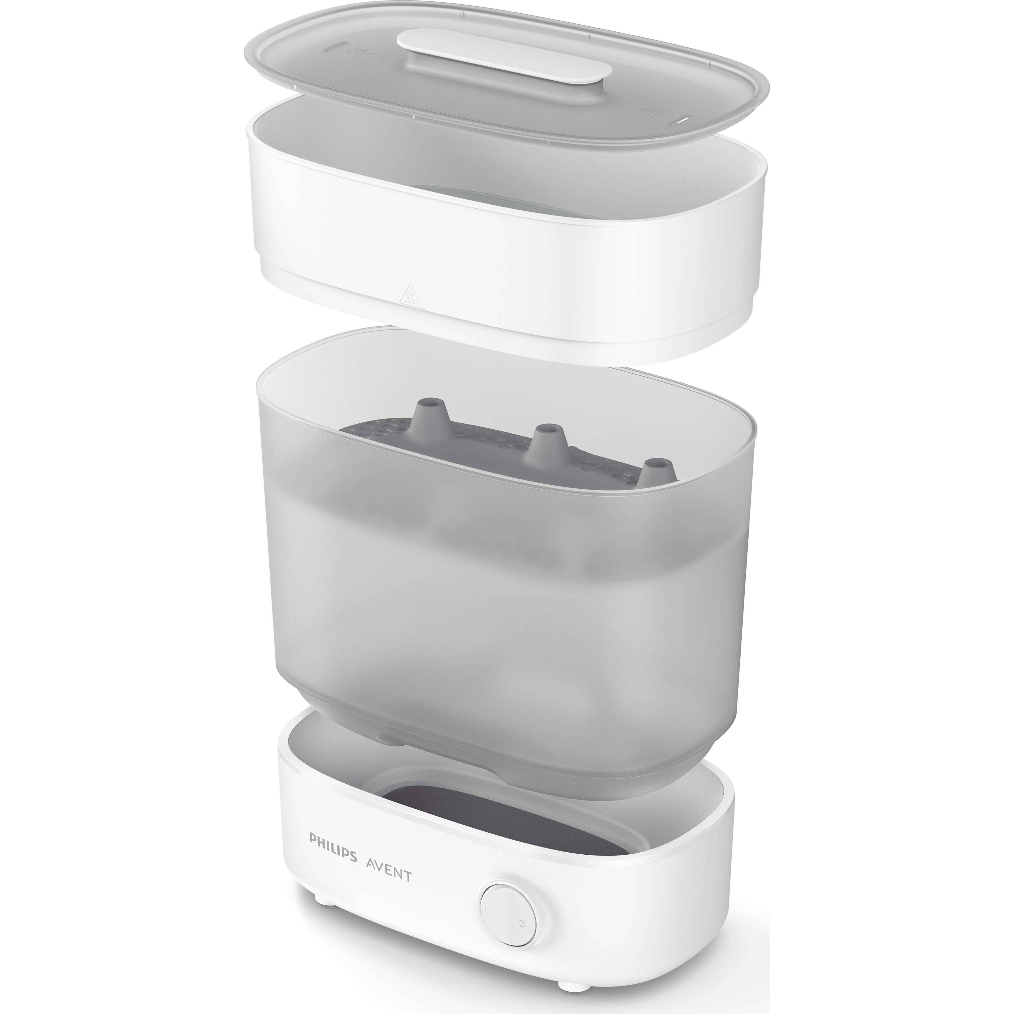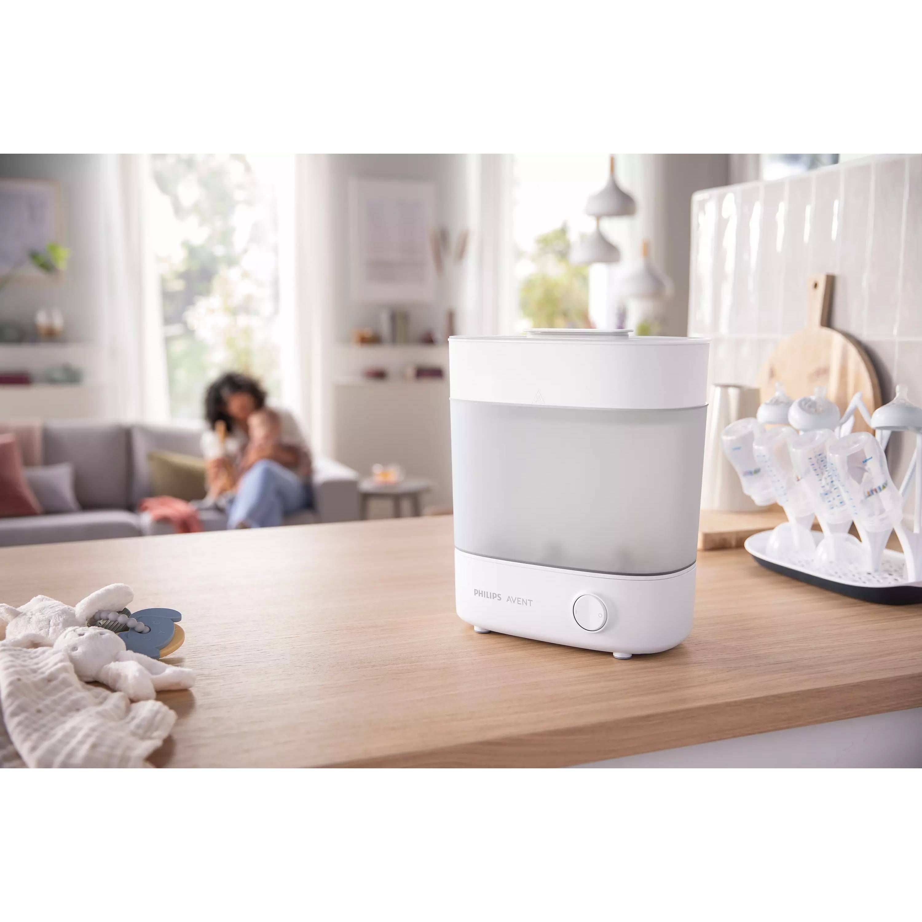 Sterilizatorul nostru a fost conceput pentru flexibilitate şi economie de spaţiu. Sterilizatorul nostru avansat este adaptabil, reducându-şi dimensiunile pentru articole mai mici precum suzete, dar şi pentru a ocupa spaţiu minim pe blatul de bucătărie atunci când nu este utilizat.