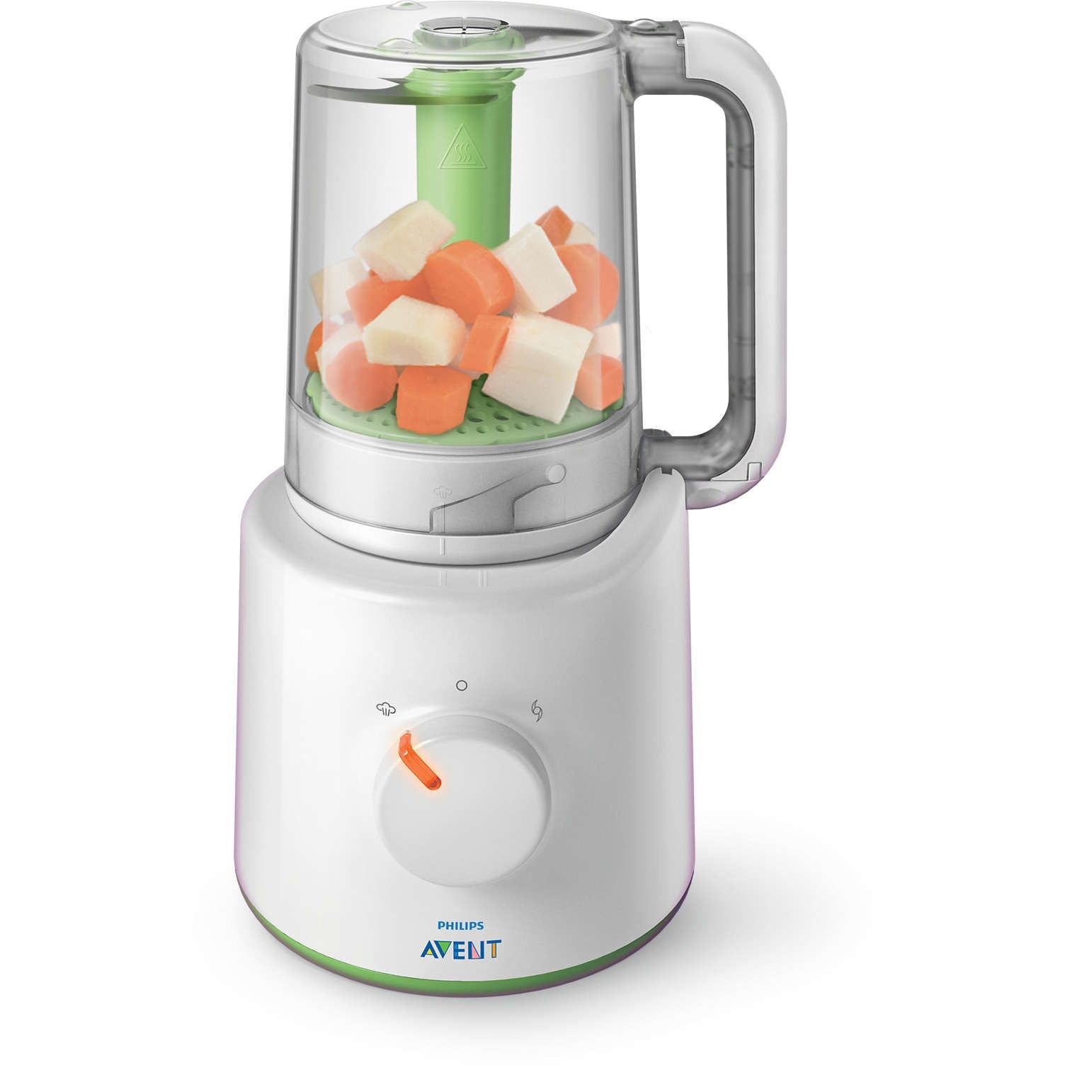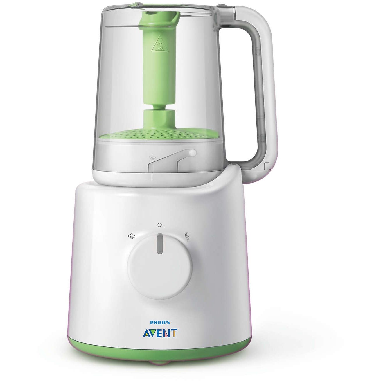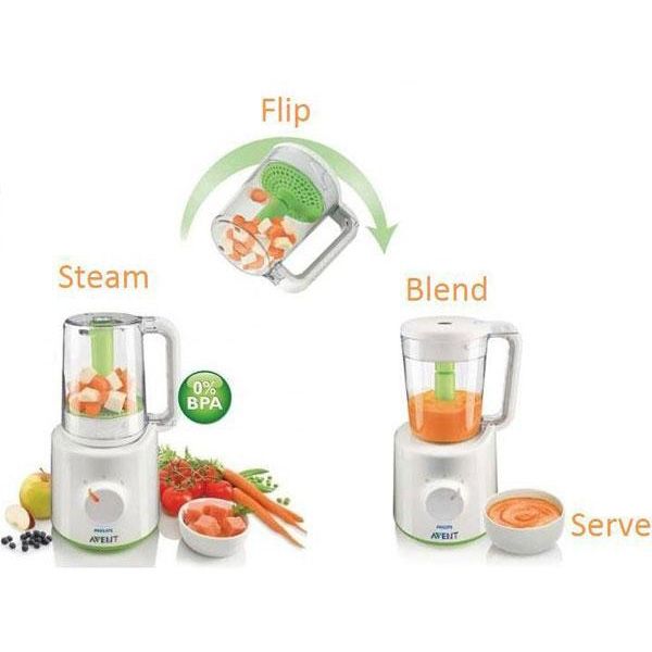 De la preparare la abur la amestecare, totul într-un singur vas uşor de utilizat. Vei găsi tot ceea ce-ţi trebuie pentru a pregăti mâncăruri nutritive pentru bebeluş într-un singur vas. După ce ingredientele sunt preparate la abur, nu mai trebuie decât să ridici vasul, să-l răstorni şi să-l blochezi pe poziţie, pentru a putea amesteca până obţii consistenţa dorită.
