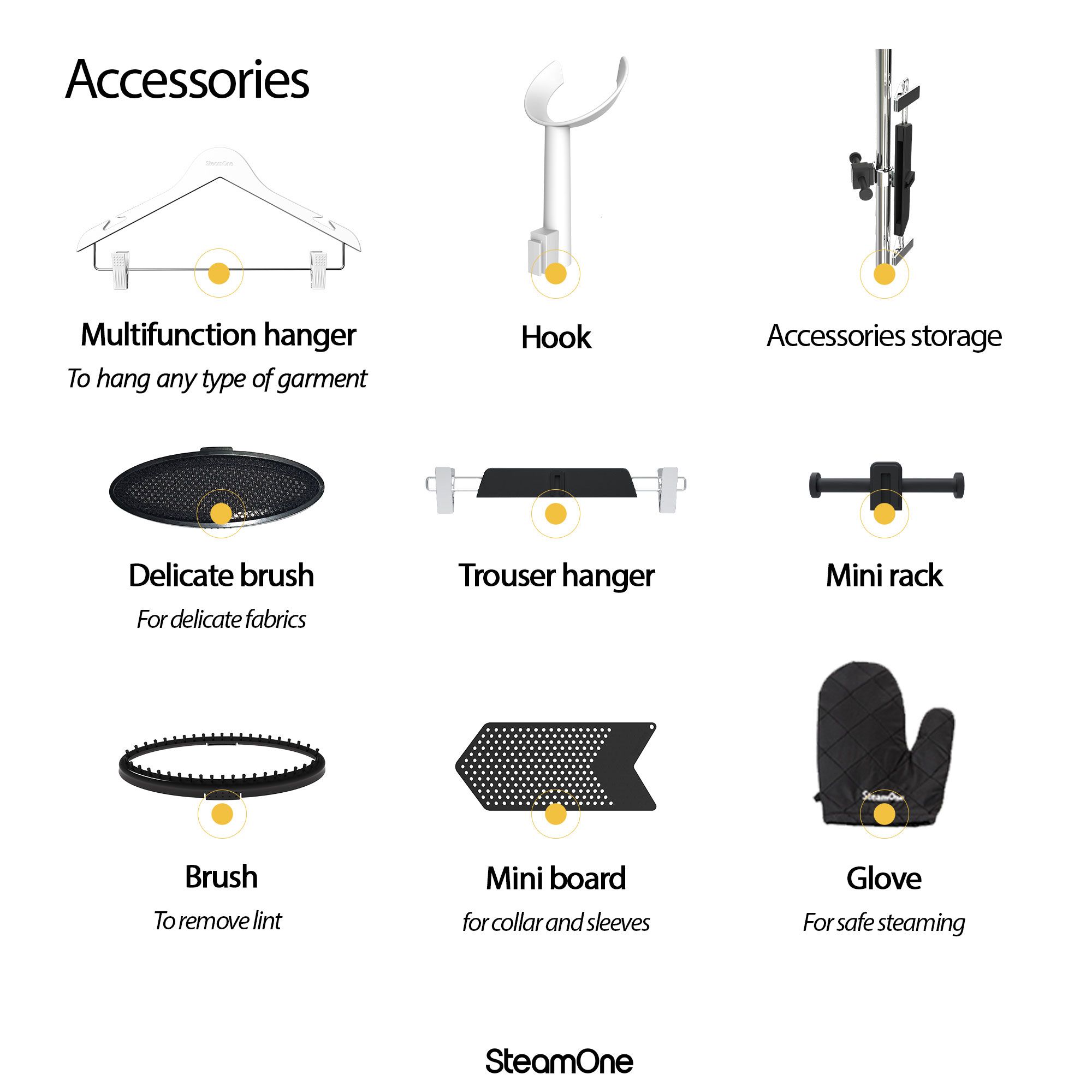 7 accesorii furnizate pentru a putea îndrepta toate tipurile de haine: cămăși, pantaloni, îmbrăcăminte din țesături fragile etc.