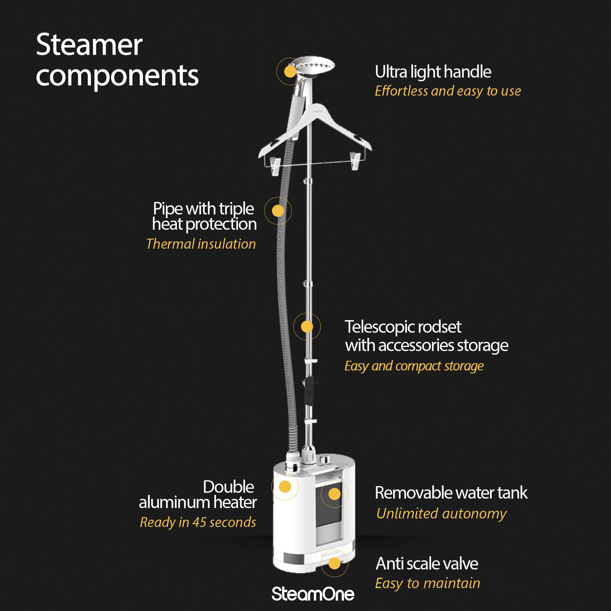 De mai bine de 9 ani, SteamOne oferă o varietate largă de aparate de calcat verticale cu aburi. Spre deosebire de alte aparate de călcat, SteamOne nu lasa urme lucioase pe materialele naturale sau sintetice si nu arde fibrele. Cercetările efectuate asupra materialelor, lanțului de vapori și a componentelor lor au permis inginerilor SteamOne să dezvolte cel mai puternic aparat de calcat cu aburi vertical de pe piață. Fabricat în Franța, Dualys Plus este modelul de top care completează gama Home a brandului SteamOne. Datorită cazanului său dublu și oferind o putere de 2300W, SteamOne Dualys Plus este cel mai puternic aparat de calcat vertical cu aburi de pe piață. Gata în 45 de secunde, vă permite să îndreptați toate țesăturile fără o masă de călcat și cu o economie de timp semnificativă datorită fluxului de abur continuu. Cu o gamă de accesorii situate inteligent pe tija, puteți utiliza cu ușurință numeroasele sale accesorii. Complet detașabil, echipat cu o tijă telescopică și mâner ultra-ușor, este compact, mobil și foarte ușor de depozitat. Cu un design elegant și intuitiv, SteamOne Dualys Plus se va integra cu ușurință în casa dvs.