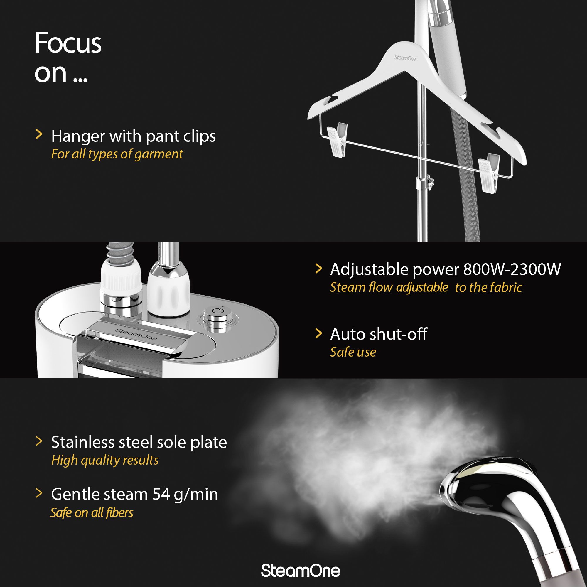 Putere reglabilă, Abur reglabil pentru a se potrivi materialului: 4 moduri pentru a adapta cantitatea de abur la diferite materiale: mătase, in, bumbac sau denim.