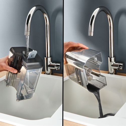 Cele 2 rezervoare - 2.3L pentru apă curată și 1,5L pentru apă reziduală - sunt detașabile și ofera o alimentare ușoară cu apă curată, respectiv curățare ușoară a rezervorului pentru apă murdară.