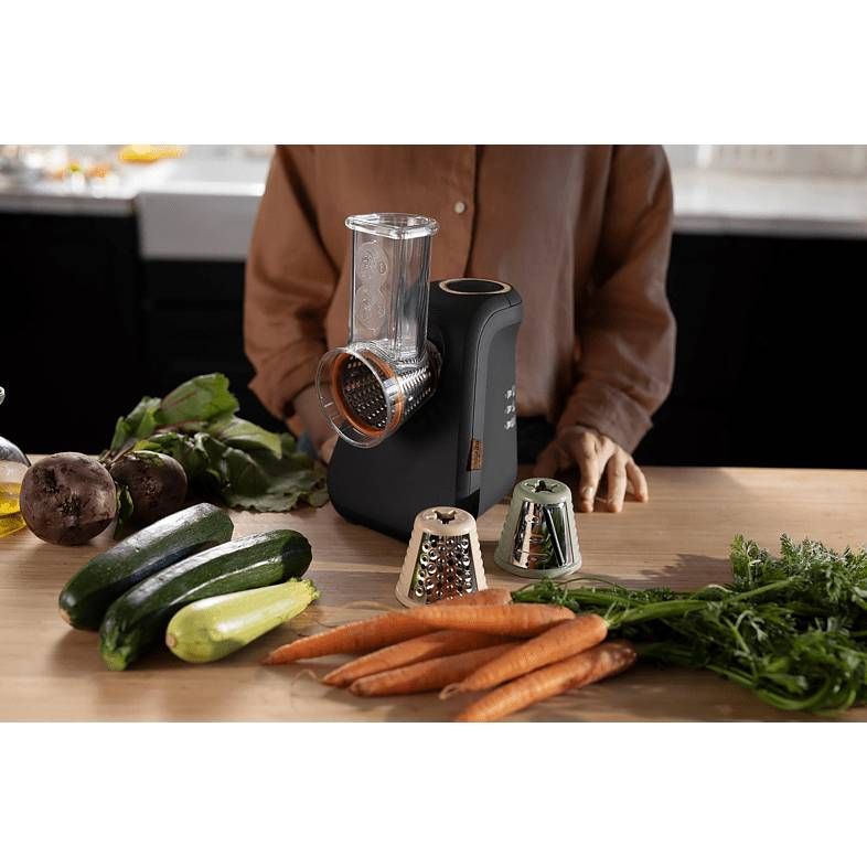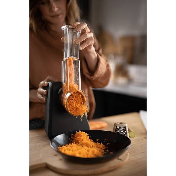 Funcții avansate Feliază, rade și toacă perfect de fiecare dată: tubul de alimentare de mari dimensiuni permite folosirea bucăților mari de legume, fără a fi nevoie să le tăi mărunt, în timp ce conurile sunt ușor detașabile. |