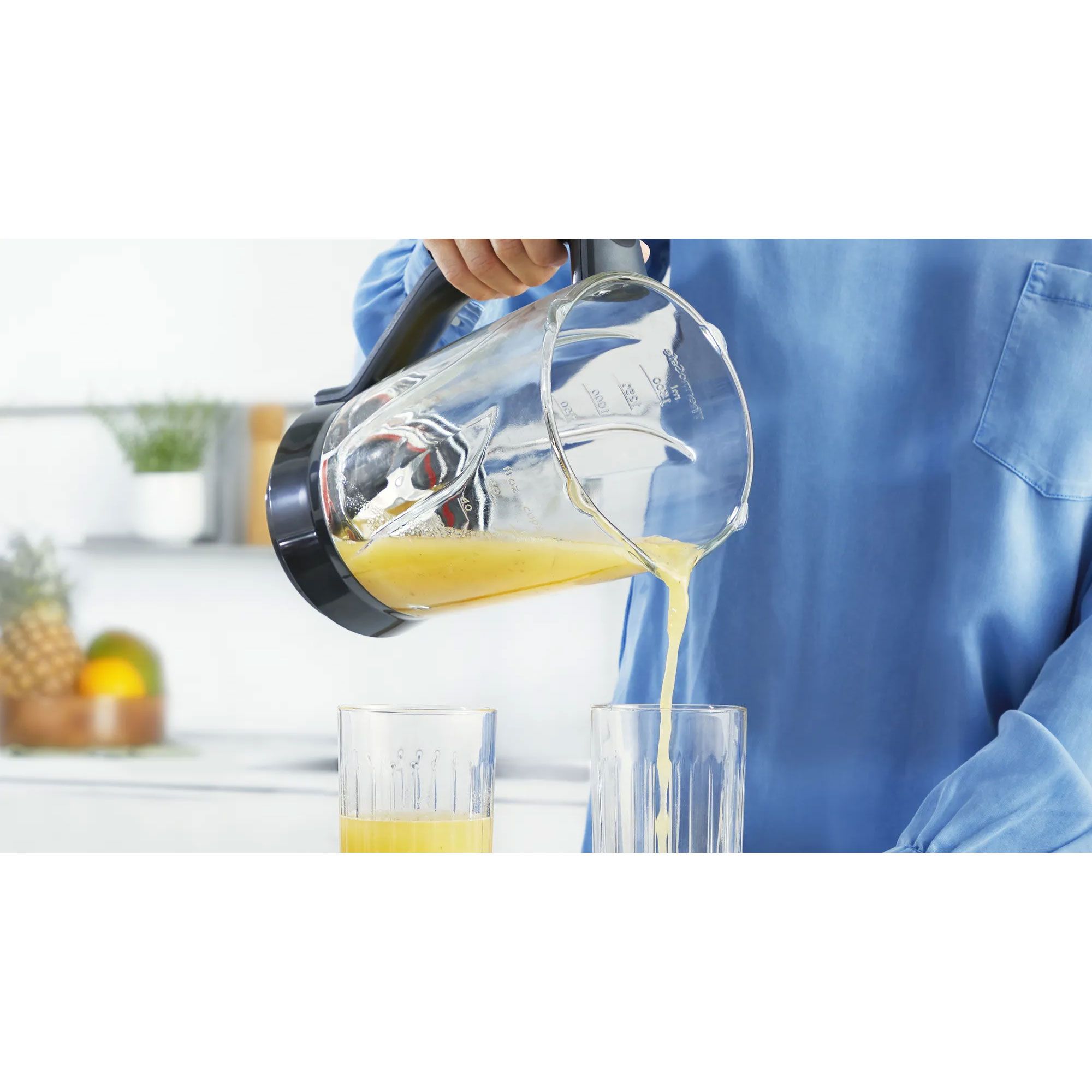 - Blender ThermoSafeglass cu capacitate de 2.3 l (volum utilizabil cu mâncare: 1.5 l) - pentru amestecarea ușoară și sigură a supelor calde și a băuturilor reci, cu nivel redus de zgomot