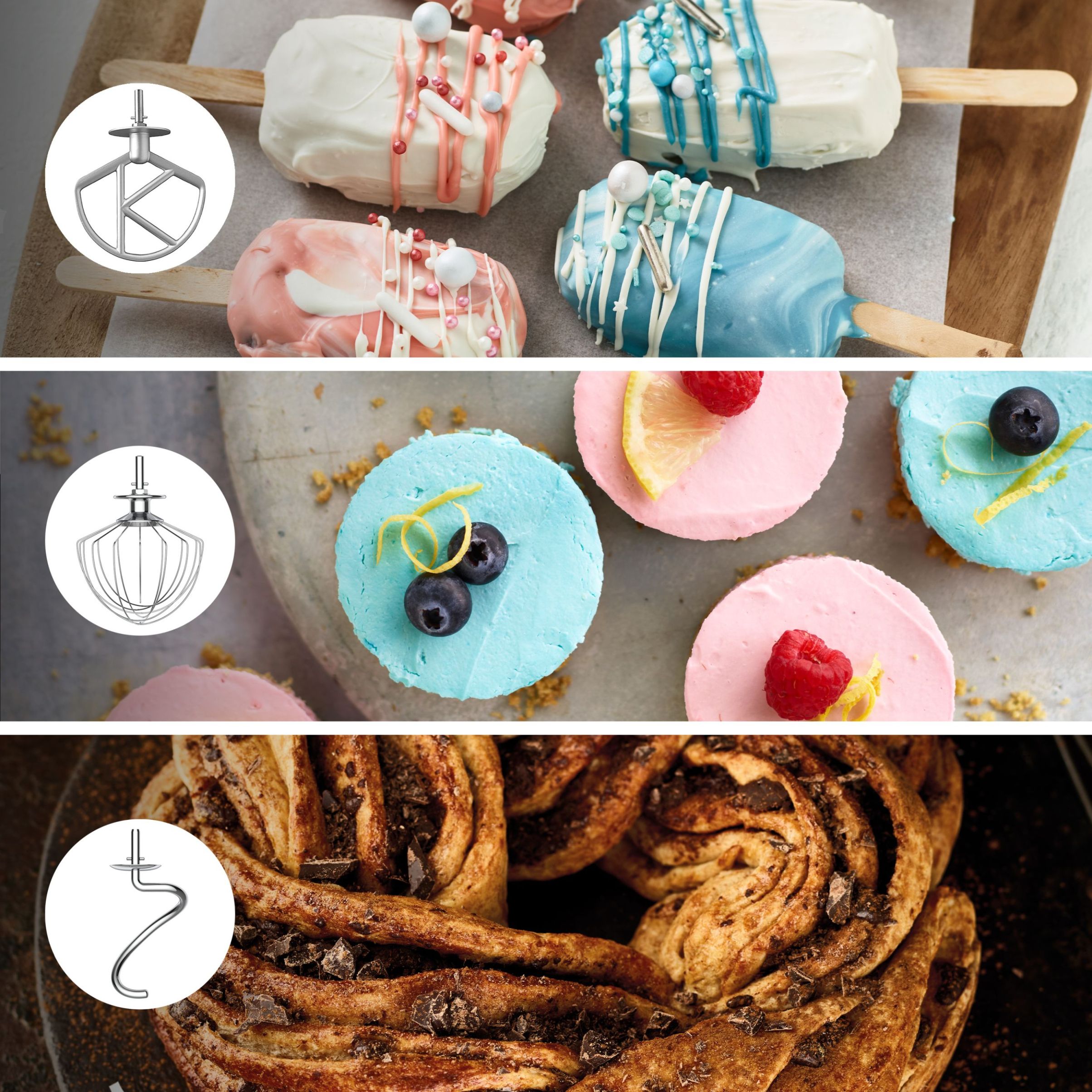 Sunteți întotdeauna pregătiți cu un set de trei instrumente robuste. Fiecare kMix este livrat cu un tel, un cârlig de aluat și paleta nostră K-Beater, o adevărată unealtă pentru gătit. Serviţi pâine și prăjituri delicioase în cel mai scurt timp.