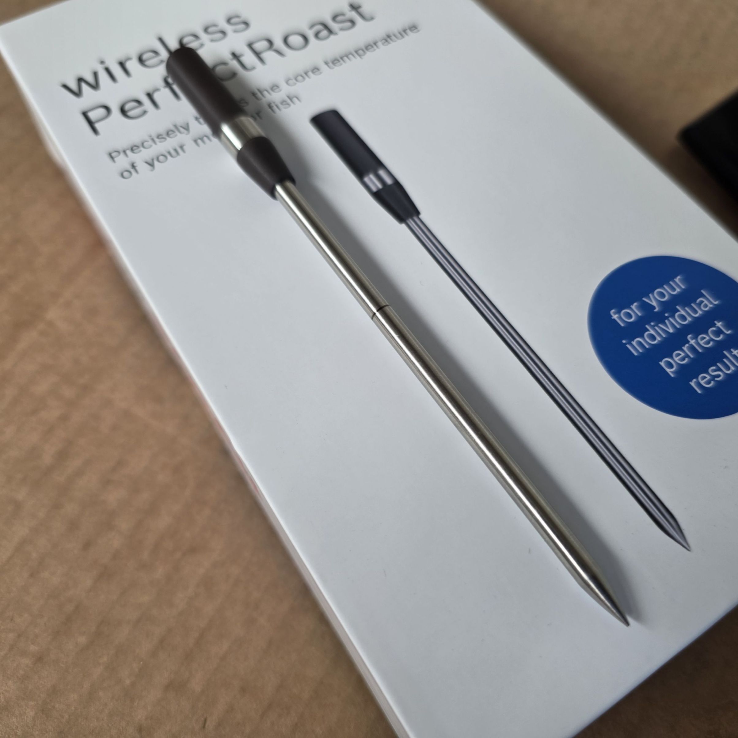 Gătești perfect cu ajutorul termometrului wireless PerfectRoast Obții rezultate perfecte de gătit cu termometrul wireless PerfectRoast! De la friptură de vită la pește întreg sau pui, poți folosi asistentul ideal de bucătărie în cuptor sau cu orice alt aparat, cum ar fi plita sau grătarul în aer liber. Acul rezistent la apă este ușor de curățat, asigurând gătirea perfectă pentru preparatele care necesită o atenție suplimentară. Optimizează experiența de gătit cu PerfectRoast wireless și bucură-te de rezultate delicioase de fiecare dată!